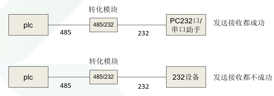 大概就是下圖這個樣子,PLC 485口子轉232 控制 設備無法通信,但用電腦串口助手看收發報文是沒問題的,是什么原因呢