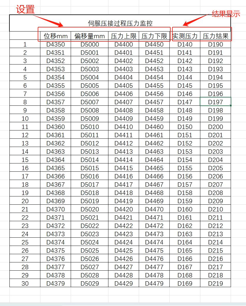 我的編程思路是根據當前的位移與設置的位移去比較,在合格范圍內把壓力傳送到實測壓力值,再根據實測壓力值與設置的上下限比較OK與NG.