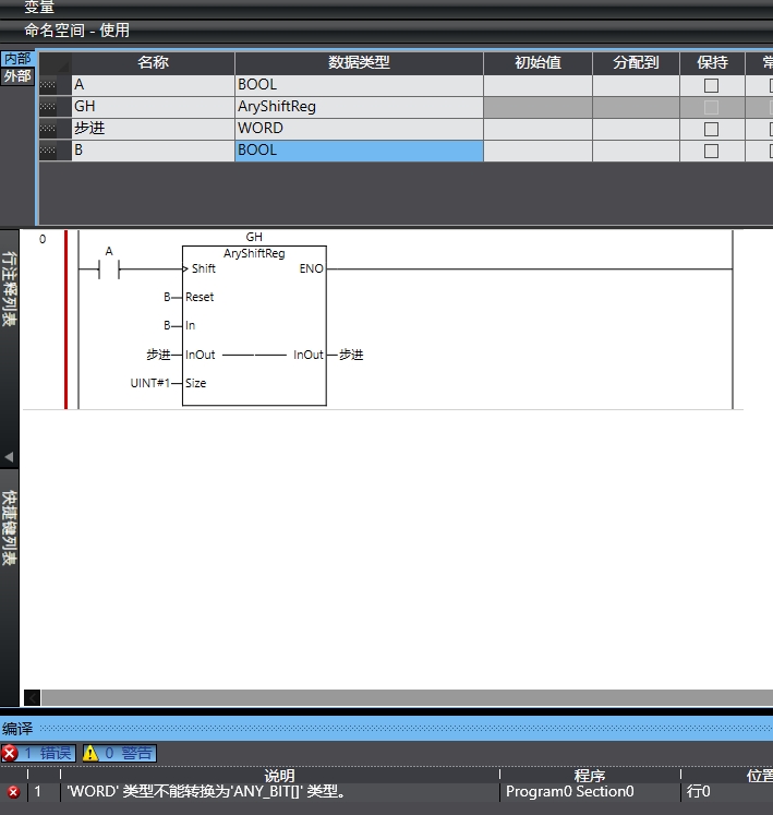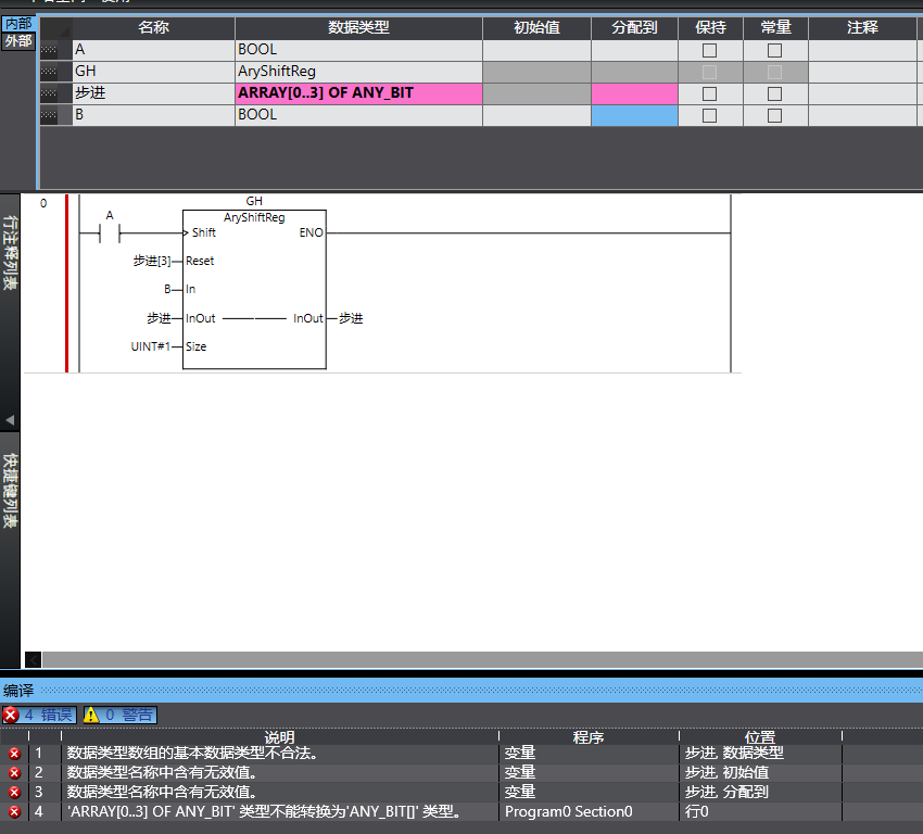 ARRAY[0..3] OF BOOL我使用的這個報警,看說明書可以使用布爾跟位列類型的,我使用BOOL或者WORD都不可以