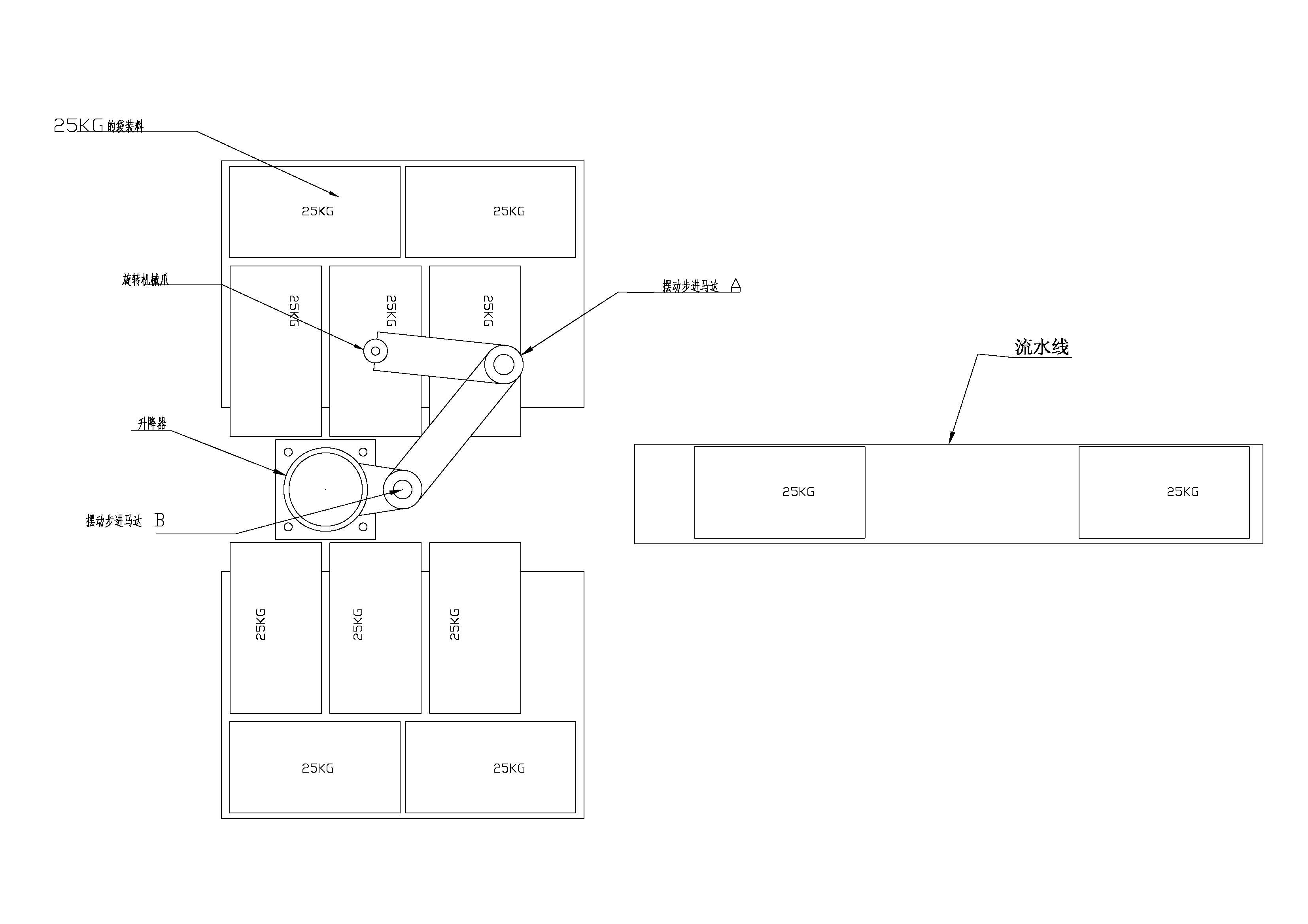 當流水線中有成品袋過來后,機械臂會自動夾起自動放到卡板中,左右都可以放。將平面圖中所示的擺放,其中隔一層反過來擺放。