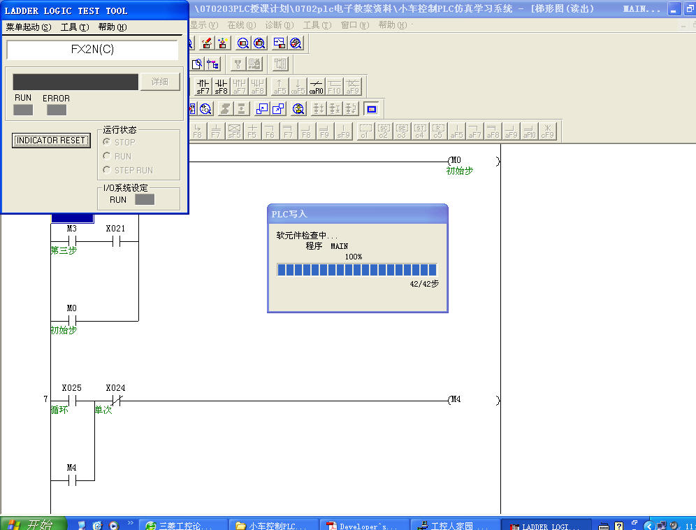 2、運行GX Developer  軟件,編寫程序,注意程序中所用的X元件和Y元件的編號必須和PLC仿真模擬學(xué)習(xí)系統(tǒng)的意一致。(本人編了一個不帶定時器的小車控制程序,運行仿真效果很好。)