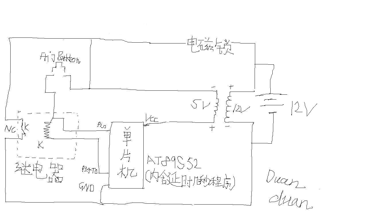 各位叔叔阿姨大哥大姐我畫了幅門禁電路版圖由于水平有限只能畫成這樣幼稚了,簡(jiǎn)要說明下上圖是12v 電源供電門禁電路簡(jiǎn)易草圖 而且只涉及到按鈕開門部分 12v給電磁鎖供電 通過變壓器轉(zhuǎn)成5v給