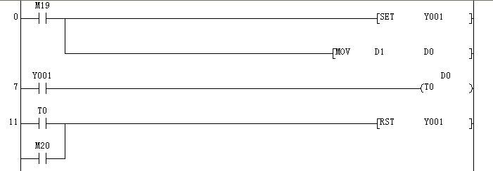 雖然SET和RST同時存在,會在執行到最后的RST指令時將Y1復位,造成Y1為OFF而T0不能斷開的假象,其實在PLC執行程序的時候,先執行到SET時仍然將Y1置位為ON,繼續掃描至T0段,Y1的狀態一直保持為ON沒有變化,所以T0會一直保持接通,不會重新計時。
